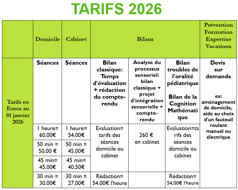 Vous pouvez contacter votre ergothérapeute afin de connaître les tarifs des interventions et pour toutes demandes de devis.